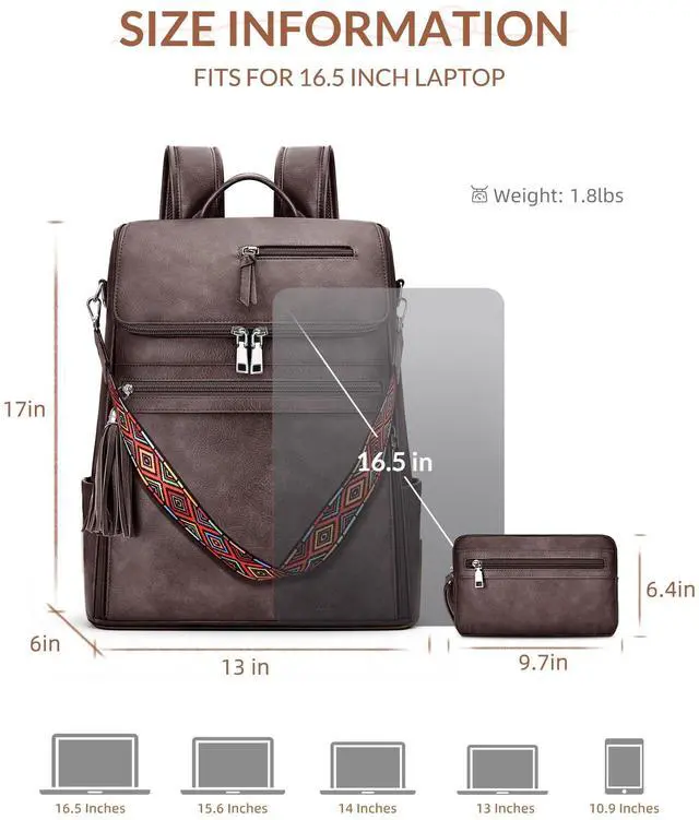 16.5 -inch laptop backpack- This laptop backpack measures 13.78"L * 5.12"D * 16.14"H and weighs 1.96 lbs. The small handbag size is 8.66"L * 0.78"D * 5.51"H. The independent laptop zipper pocket is designed to hold laptops up to 16 inches (such as 16, 15.6, 15, 14 and 13 inches). The separate laptop pocket provides better protection for the laptop and is more convenient to use during operation. No matter when or where it is placed, it can stand upright very well ^^ Multi-pocket Laptop Bag Design- This laptop backpack for women has 13 pockets, including 1 main compartment, 1 zipped computer pocket, 4 front zipped pockets, 2 back zipped pockets, 2 side pockets, 2 inner slip pockets and 1 inner zipped pocket.