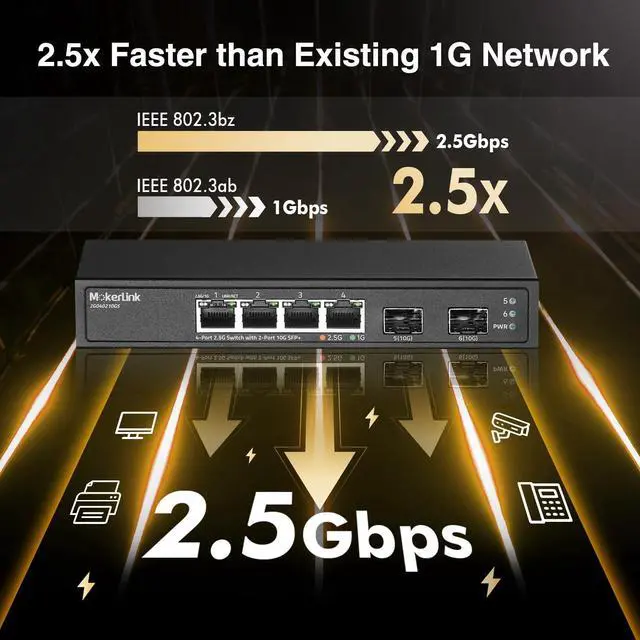 Ports: The network switch has 4 x 2.5G igabit Ethernet Ports, compliant IEEE 802.3 bz ( 2.5G ) standard, support 10/100/1000M/ 2.5G adaptive. 2 x 10G SFP Port(compatible 1G/ 2.5G Module, not include SFP Module). 60Gbps backplane bandwidth, excellent data forwarding performance ^^ Easy to