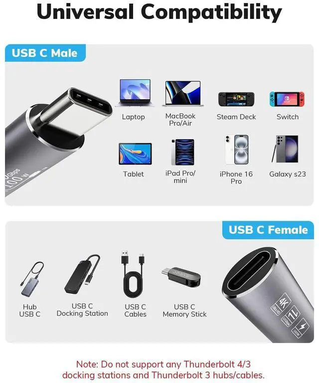 Note: The charging device must support 100W fast charging. ^^ Exceptional Durability Our USB C extension cord is made with an aluminum alloy shell and a nylon braided thread body. The aluminum alloy shell is resistant to corrosion and oxidation and offers superior heat dissipation performance. The nylon braided thread body is tensile and pull-resistant to minimize wear. ^^ Broad Compatibility Our USB C cable extender has perfect compatibility with most USB C devices, including desktop computers, laptops, smartphones, monitors, projectors, tablets, and various USB C docking stations. ^^ Important Note This cable is designed to be used with docking stations, ensuring compatibility with your devices.