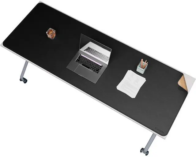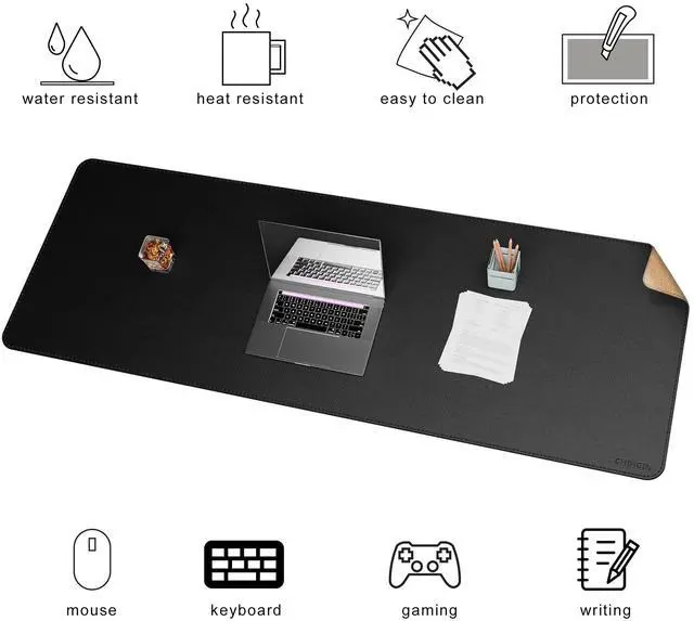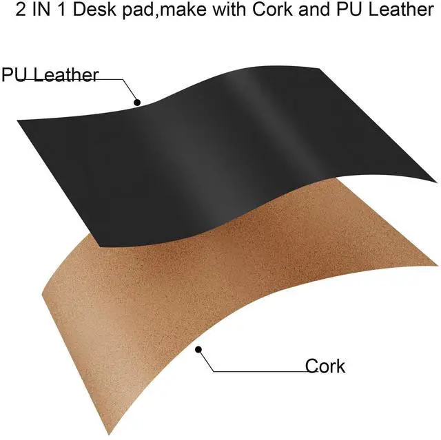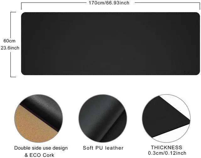 Huge Mouse Pad: This 66.93 x 23.62 (170cm x 60cm) premium office desk mat can fully cover the computer desk. It is very suitable as a black desk mat for offices or homes, and its ideal size can complement large-sized office desks or dining tables. ^^ Cork & PU Leather desk mat: This desk mat is made of a combination of cork and synthetic leather. The leather surface is smooth, making it easy for the mouse to slide smoothly. The cork bottom is non slip, preventing the desk pad from sliding on the desktop. The leather and cork surfaces can be used on both sides.