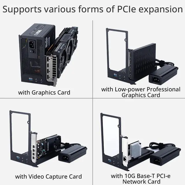 ^^ Wide Compatibility: The eGPU dock is compatible with NUCs, laptops, and gaming machines featuring USB4/TB3/TB4 interfaces. Support NVIDIA (including latest RTX 50 Series 5090 D/5080/5070 Ti/5070, etc. )/AMD (including latest RX 9000 Series) GPU.