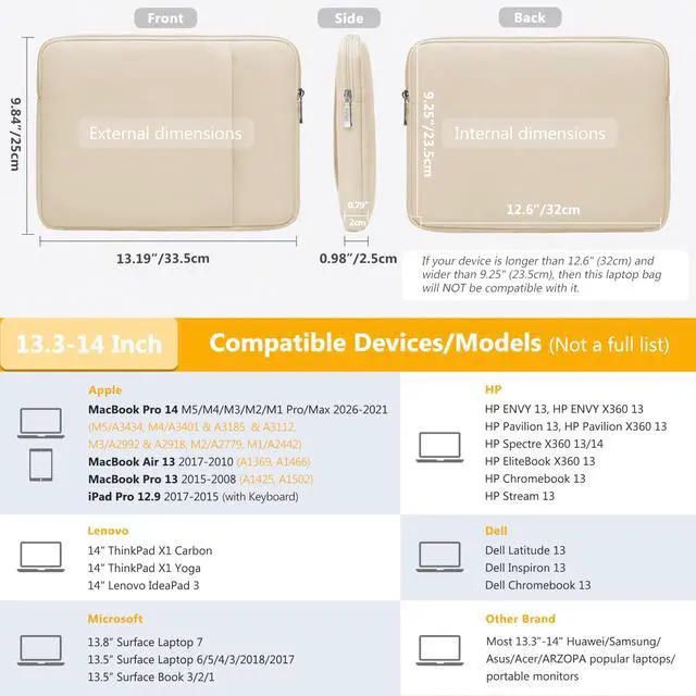 • Internal Dimensions: 12.6" x 9.25" x 0.79". Compatible with MacBook Pro 14 M5/M4/M3/M2/M1 Pro/Max 2026-2021 (Model: A3434, A3401, A3185, A3112, A2992, A2918, A2779, A2442), MacBook Air 13 2017-2010, MacBook Pro 13 2015-2012, HP Envy/Stream/Pavilion/Chromebook 13, HP EliteBook X360 13, HP Spectre X360 13/14, iPad Pro 12.9 2017-2015, ASUS Zenbook/Vivobook/Chromebook 13, 13.8"-13.5" Surface Laptop/Book, Dell Latitude/Inspiron/Chromebook 13, 13.3" ThinkPad X390, and most 13"-13.3" slim laptops, etc.