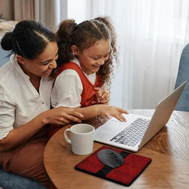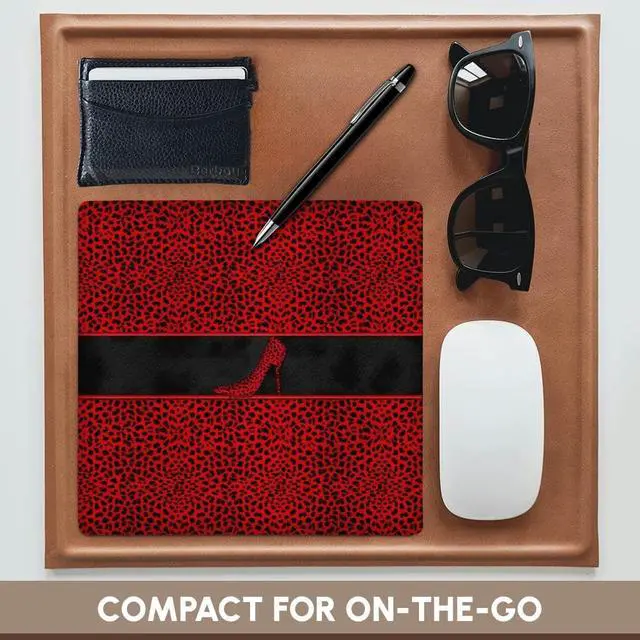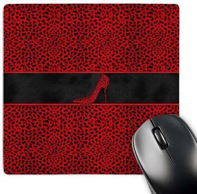 Red Cheetah Print and Stiletto Heel Mouse Pad is 8" x 8" x. 25" and is made of heavy-duty recycled rubber. Matte finish image will not fade or peel. Machine washable using a mild detergent and air dry.