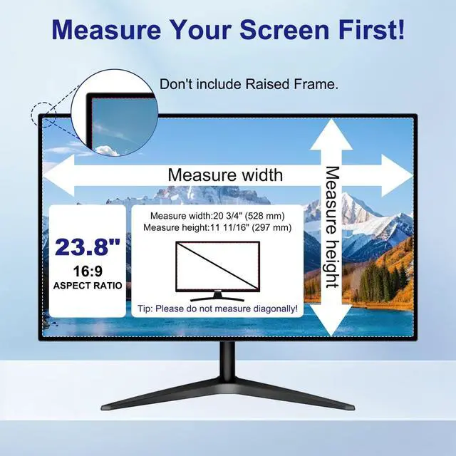Monitors Diagonal: 23.8" ( 604.52 mm), Width: 20 3/4" (528 mm), Height: 11 11/16" (297 mm). - LUSA DESIGN 23.8 inch Privacy Screen Filter is engineered to be compatible with 23.8 in Dell, HP, Samsung, Lenovo, LG, Acer, ASUS, Toshiba, ViewSonic, Aoc, Sceptre, PHILIPS, ViewSonic and other brands monitors with 16:9 aspect ratio. Confirm your screen dimensions (inches/cm) before ordering. If you have any questions about the dimensions, please contact us. ^^ Advanced 30-60 Privacy ProtectionLUSA DESIGN collected suggestions from more than 2000 computer users and performed 21188 anti-peep angle corrections on the micro-blind optical technology to ensure that any line of sight beyond +-30 facing the screen will be shielded. With a computer privacy screen 23.8 inch, Protect the privacy of your computer monitor screen and no longer leak any confidential data. ^^ Blue Light & UV Ray Defense Our product adopts professional harmful light filtering technology. So it has the function of filtering 95% of harmful blue light and 98% of UV light without reducing clarity. It can directly and effectively reduce eye dryness and fatigue, and protect vision during extended screen use, offering a healthier viewing experience.