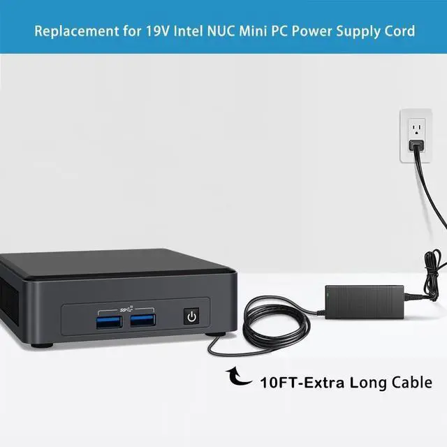 Output: 19V 6.32A 120-Watt, Also Compatible with 19v 4.74 a 90w. Positive Tip; Free Extra Long AC Cable Include. Total Intel NUC Power Cord Length 10FT. ^^ Safety SecurityOur mini pc power cord are UL / FCC / CE / Rohs Certified, which in compliance with top industry standards. Our adapter was made with the highest quality and the newest materials. V-0 grade flame retardant, Ovp, Ocp, Scp