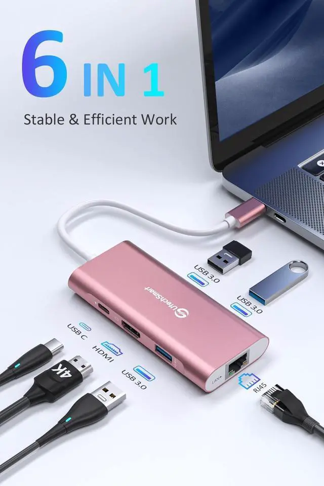 Cost-Effective UtechSmart USB C Hub has a 1000M Ethernet port, a 4K HDMI port, 3 USB 3.0 up to 5 Gbps and a USB C charging port with 100W power delivery to make a perfect all-in-one solution for your connectivity needs. ^^ Stay Cool, Stable Connected With our advanced technology, the USB C adapter features advanced heat dissipation and safe connections to keep your devices safe and your data secure. ^^ Experience Lightning-Fast Upgrade your connectivity with our USB-C hub's 5Gbps data transfer and 1000M Ethernet port. With lightning-fast transfer speeds and reliable internet connectivity, you can seamlessly stream movies, download large files, and more.