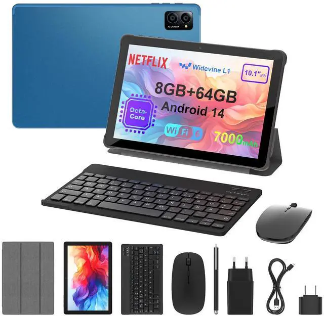 Complete Accessories for Work & Creativity This 10-inch Android 14 tablet comes with a keyboard, mouse, stylus, Type-C adapter, OTG adapter, charging adapter, and a protective stand case, offering a laptop-like experience. Whether you need it for office tasks, note-taking, or digital drawing, this bundle delivers everything for seamless productivity and entertainment ^^ Powerful Performance & Large Storage Featuring a fast octa-core processor and 8GB RAM, this tablet provides smooth multitasking for apps, gaming, and video streaming. With 64GB internal storage, expandable up to 1TB via microSD, store all your important files, apps, and media without limitations ^^ Vivid 10.1" IPS HD Display & Precise Stylus Support Enjoy a crisp 1280x800 resolution IPS display that delivers sharp visuals and vibrant colors, ideal for watching Netflix, Disney+, YouTube, or working on documents.