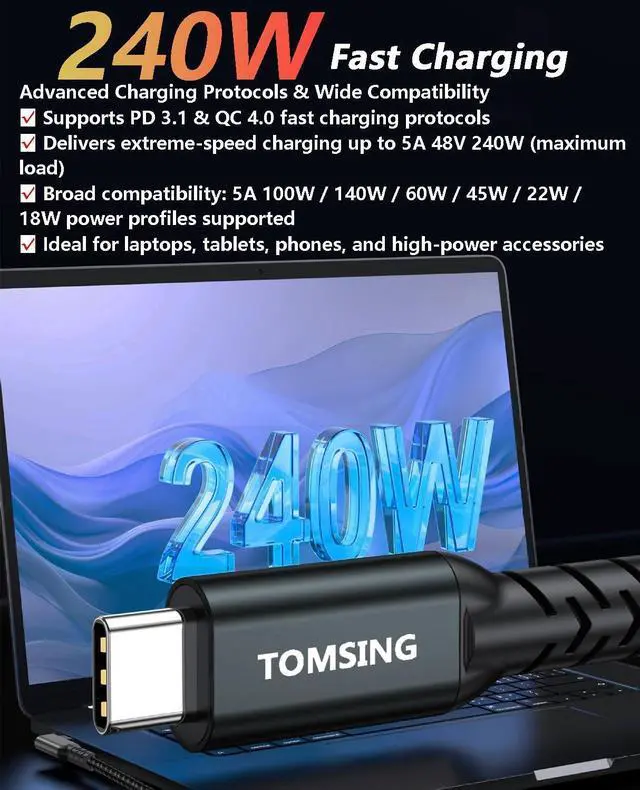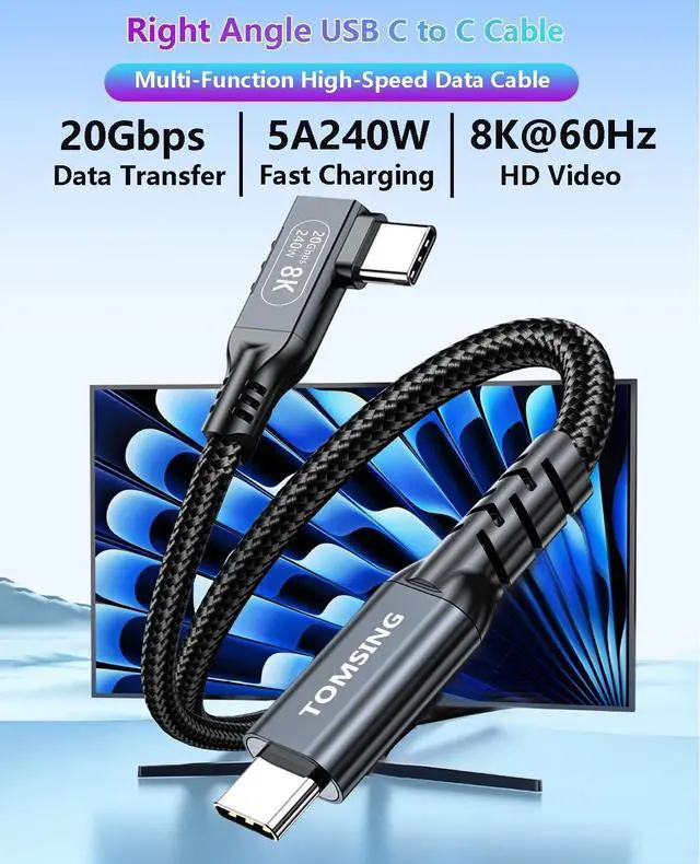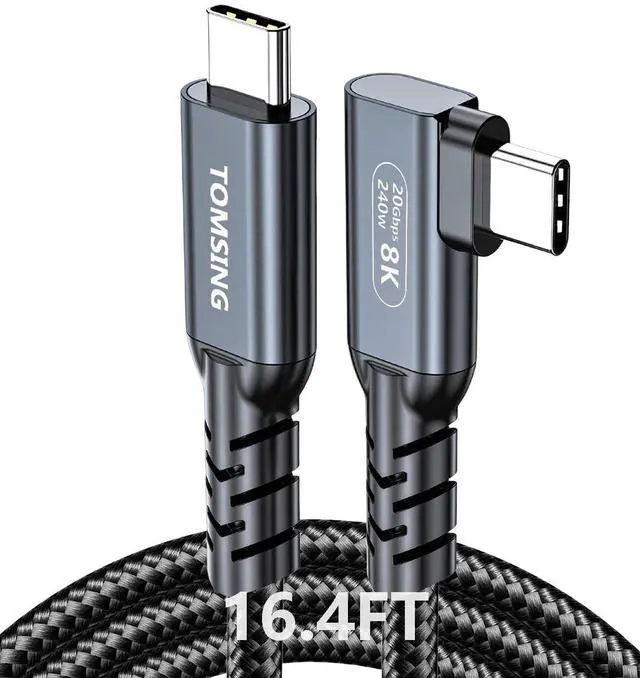 USB C to USB C Cable90 Right-Angle Type-C Male Plug A high-performance data cable using USB 3.2 Gen 2 technology, featuring dual USB Type-C connectors. Supports bidirectional high-speed data transfer and fast chargingFeatures an ergonomic 90 right-angle design for comfortable use in tight spaces like behind TVs or in-car charging ports. ^^ Built-in Smart Chip+5A/240W Fast ChargingEquipped with an intelligent chip that accurately detects and delivers the optimal current for connected devices. Ensures stable and safe power delivery, protecting devices while enabling fast charging. So this USB Type-C cable supports fast charging up to 5A/240W.