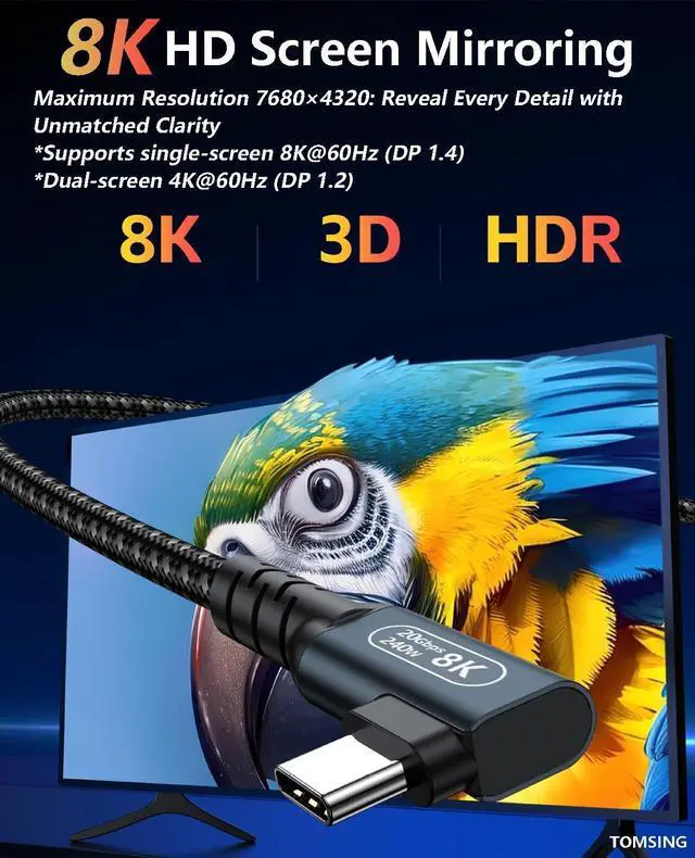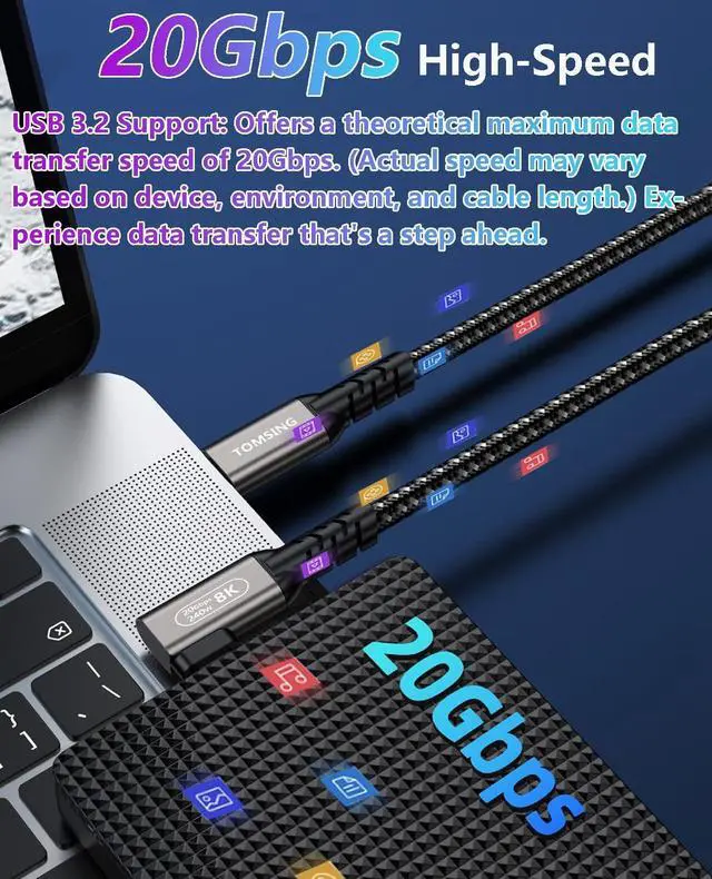 Whether it's your phone, tablet, or laptop, it powers them up quickly, helping you say goodbye to battery anxiety and enjoy efficient, lasting power. ^^ 20Gbps high-speed transmission+8K@60Hz High Resolution Video SupportUtilizing USB 3.2 Gen 2 technology, it achieves a theoretical maximum transfer speed of 20Gbps, enabling rapid transfer of large files. With a high-speed transmission capability of 20Gbps, this cable supports 76804320@60Hz 8K video signal transmission, delivering fast and lag-free visual performance(Note: Please ensure your connected devices support video input/output via Type-C ports. ) ^^ Nylon Braided CableTinned Copper CoreFeaturing a tinned copper core for low resistance and stable conductivity, Tin plating prevents reactions between copper and insulating materials while maintaining the conductivity of the copper. The multi-layer insulated shielding structure maximizes interference reduction. The outermost layer is made of high-density nylon braiding, offering enhanced aesthetics and wear resistance. ^^ Aluminum Alloy Shell + Reinforced Strain ReliefThe aluminum alloy shell, crafted with integrated molding, not only offers a premium feel but also delivers excellent drop resistance and anti-oxidation properties, extending the products lifespan. The seamless integrated plug is more durable than seamed plugs. The reinforced strain relief design allows for flexible bending without easy damage, ensuring sturdiness and long-term use.