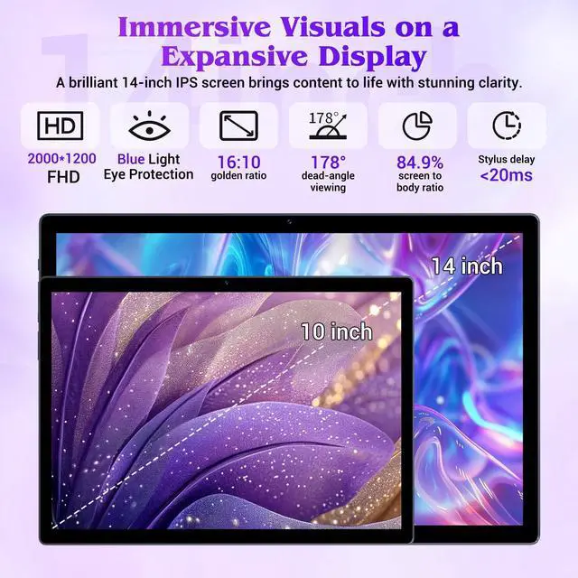 • Immersive Visuals and Sleek Design Experience stunning clarity on this 14 inch tablet with a 2000x1200 FHD display that rivals 2k tablet quality. The 16:10 golden ratio and 84.9% screen-to-body ratio offer an expansive view, while 300nit brightness and 178 wide viewing angles ensure visibility in any setting. Blue light protection reduces eye strain during extended use. This sleek android tablet features a metal body and straight bezel, making it a stylish choice for tablets for everyone and a premium pick in electronics tablets. Its durable design blends fashion with function, perfect for daily entertainment and work.