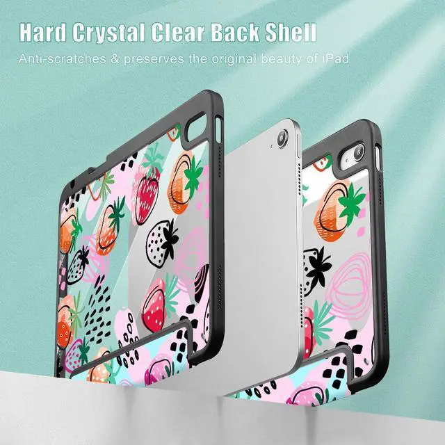 ICEKEE Case for iPad (A16) 11th Gen 11 Inch 2025, iPad 10th Gen 10.9 inch 2022 with Pencil Holder, Slim Printed Stand Protective Cover with Hard PC Translucent Back Shell Cover, Hand Drawn Strawberry