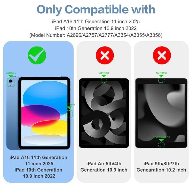 • CompatibilityWenlaty shockproof case is optimally designed for iPad A16 11th generation 11 inch 2025 new(Model Numbers: A3354/A3355/3356), and for iPad 10th Generation 2022 (Model Numbers: A2696/A2575/A2777) NOT compatible with any other devices. To ensure that you have purchased the correct case, please verify the model number "AXXX" in small print on the back bottom of your device