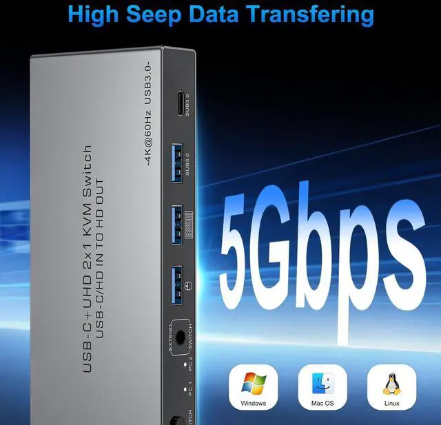 High Data Transfer Rate: The 1 keyboard 2 computers switch is equipped with three USB A 3.0 ports and one USB C 3.0 (data) port. Provides you enough external device ports for connecting mouse, keyboard, printer, hard disk or other high speed USB devices. USB 3.0 ports support 5Gbps data transfer rate, which is 10 times higher than USB 2.0.