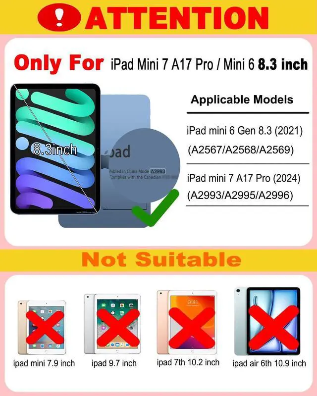 Applicable ModelThe Keyboard case is only compatible with iPad Mini 7 2024 (A2993/A2995/A2996)/Mini 6 2021 (A2567 A2568 A2569) 8.3 inch. Please check your iPad model in [Settings > General > About].