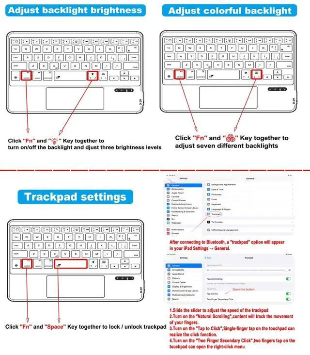 (Note: This product cannot be used with other models. This product does not include the tablet and stylus) ^^ Smart Touchpad, Supports Multi-touchThis Magic Style keyboard has a built-in smart touchpad that supports 1-finger, 2-finger, 3-finger multi-touch gestures. This is very convenient for editing files, browsing the web, and switching pages, providing efficiency ^^ Magnetic Case, Support Horizontal and Vertical ScreensThis keyboard case has a strong magnetic suction, which can stabilize tablet on the keyboard case to prevent the tablet from accidentally falling. The tablet can be adsorbed horizontally or vertically on the keyboard case, so that you can easily switch between work and entertainment ^^ 7 Backlight Colors, Type-C ChargingBacklit Keys Can Offer a Comfortable Typing Experience When You Are in Dark Environment, and a Scissor Mechanism for Smooth, Responsive Typing. The keyboard has 7 backlight colors and 3 brightness levels adjustable, Type-C charging port is very convenient for you to charge the keyboard ^^ Slim Design, Light WeightThis trackpad keyboard case is designed to be ultra-thin and light, and can be easily picked up with one hand, making it a good companion for you in the office, at home, in a cafe, and when traveling.