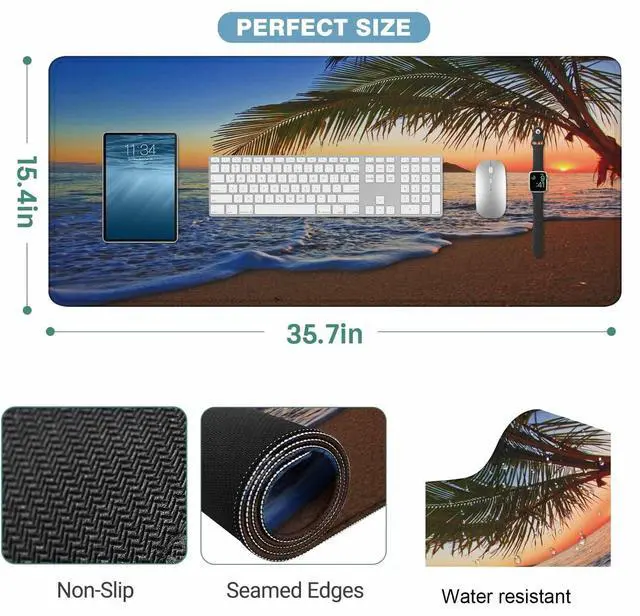 The mouse pad for desk size is 900 x 400 x 3mm ( 35.4 x 15.7 x 0.11 inch). About the package is includ one piece mouse pad, which lagre big extended size mousepadthe material is Chamfered fabric and Rubber Base. The soft and dense non-skid nature rubber base keeps the mat firmly in place, it can effectively prevent the mouse and keyboardfrom sliding and moving. suit to all types of desks including wood, glass, leather, metal, marble desk and so on. desk pad is flexibleenough to be rolled up carry, if you want to use when travel.