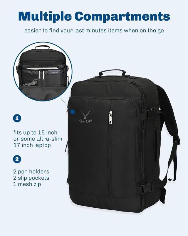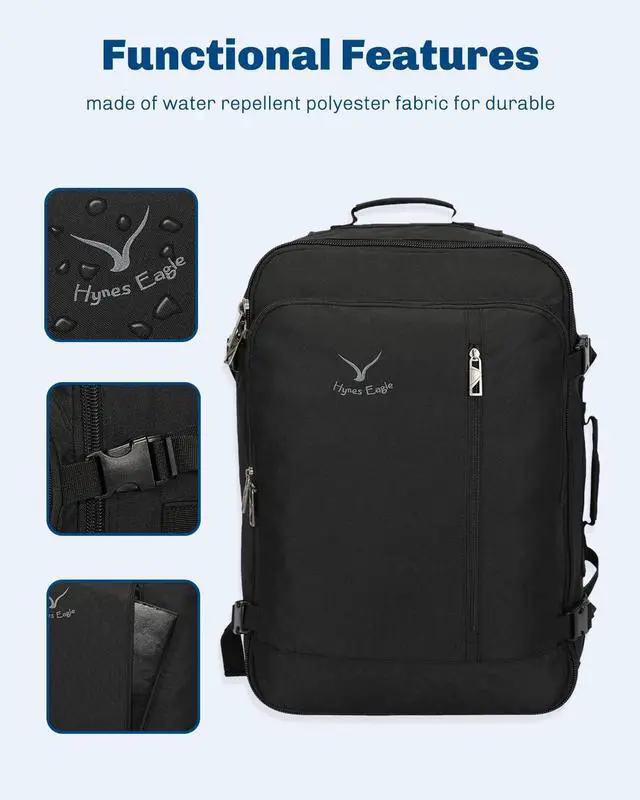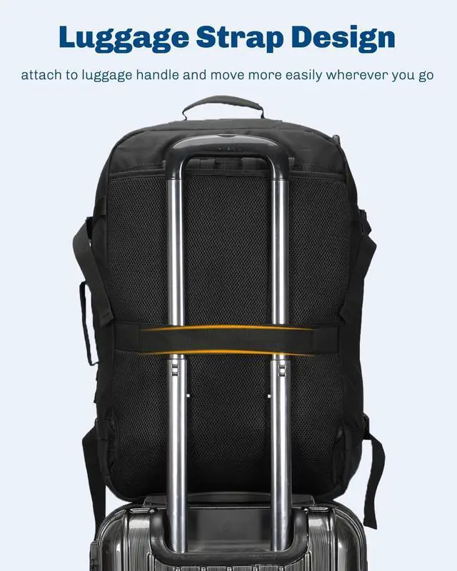 Comfortable to Carry hide-away contoured travel luggage backpack straps are well padded with air mesh, can carry it comfortably as a carry on backpack or also can easy convert it into a weekender duffel bag; provide 3 carrying options for travelers' multiple alternatives; there is a sternum strap that adjusts lengthwise and slides up and down the shoulder straps; 2023 ver. with added back trolley strap fits over most upright handles for seamless, on-the-go-travel. ^^ Functional Compartmentstravel backpack for men women has a large main compartment with tie down straps help to organize your travel essentials; zippered front pocket is perfect for boarding passes and will not "walk open", interior slot pockets for travel belongings, from passport to tablet ^^ Easy to Compress traveling backpack has 4 exterior compression straps are carefully placed to provide maximum compression and reduced stress on the zippers; so if travel with a partially packed bag, you can preventing the contents from sloshing around ^^ Flight Approved Size weekender backpack designed to fit maximum size allowed on the most of IATA flights, available to fit in the overhead compartment and the under seat storage in flight.