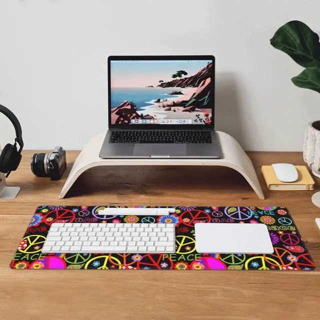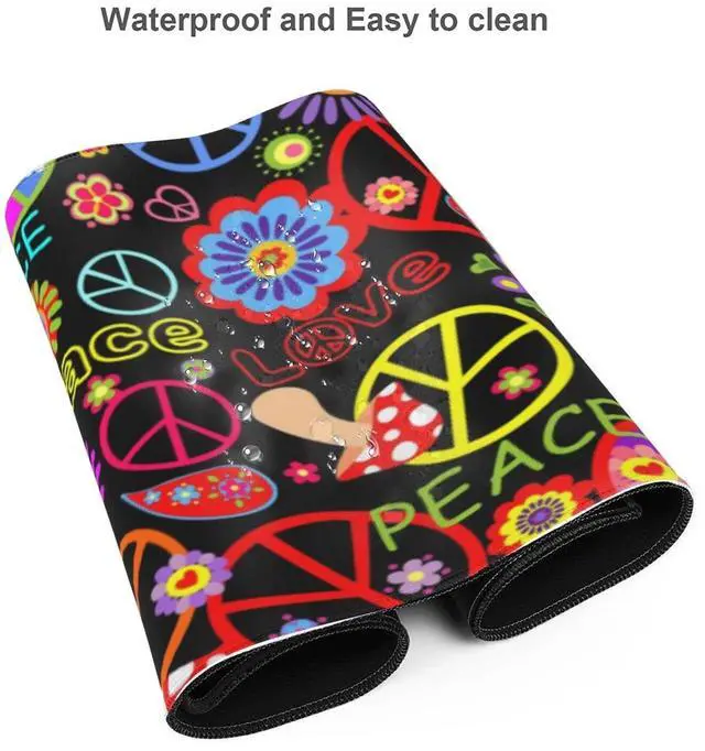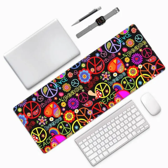 Famame Laptop Mouse Pad Colorful Hippie Peace Love Pattern Desk Mat with Stitched Edges 31.5X 11.8 inch Non-Slip Large Keyboard Rubber Writing Table Mat for Office Home