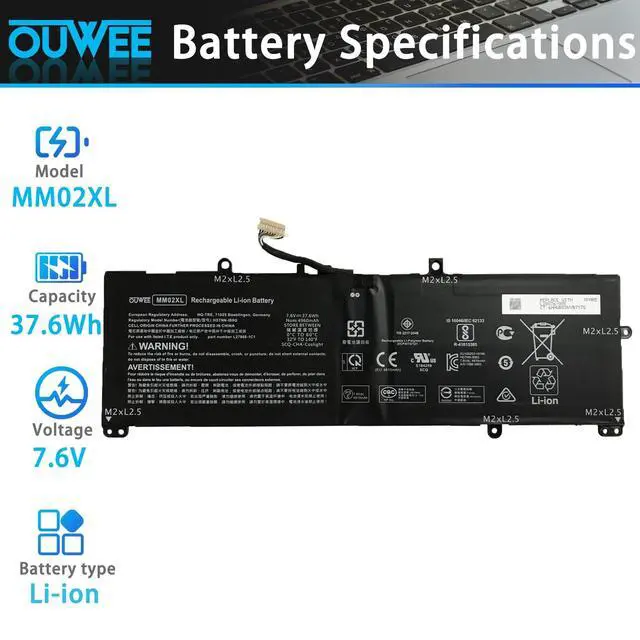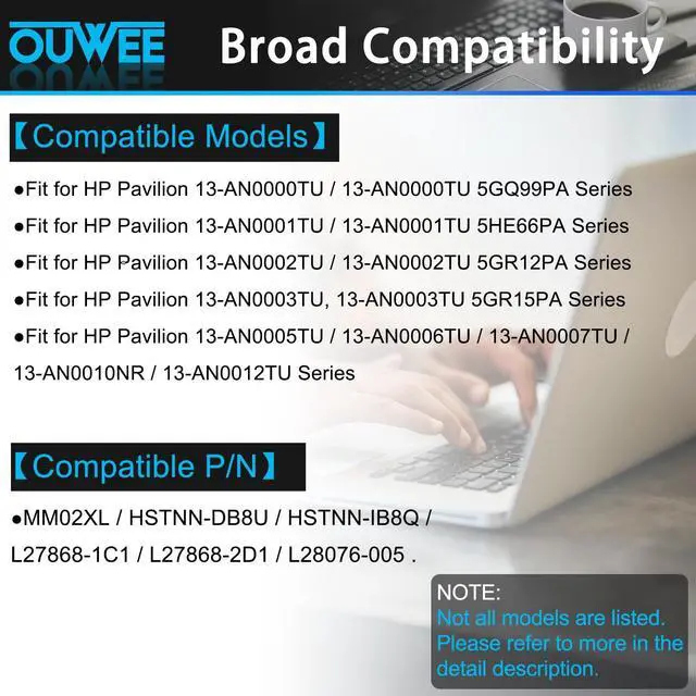 Capacity: 37.6W h 4960mAh. ^^ Compatible Part NumberMM02XL HSTNN-DB8U HSTNN-IB8Q L27868-1C1 L27868-2D1 L28076-005. ^^ Replacement For LaptopHP Pavilion 13-AN0000TU 13-AN0001TU 13-AN0004TU 13-AN0010NR 13-AN0012TU Series. ^^ ConnectorBefore placing your order, Please refer to the picture and check it. Because the products produced by different factories will have differences, such as size, cable length, interface, etc. ^^ Use SkillsIf the new battery is not recognized during the initial installation, please reinstall and check if the interface is fully connected. Discharge the new battery to 5% (not 0%), then charge and cycle 3-4 times to wake up the new battery.