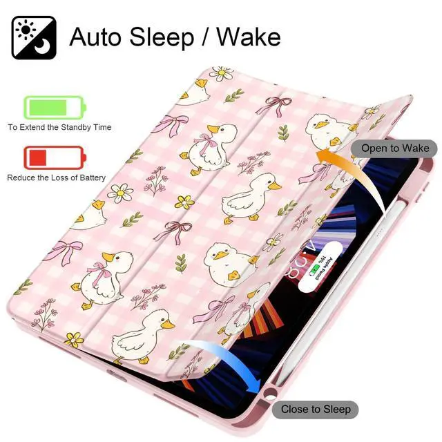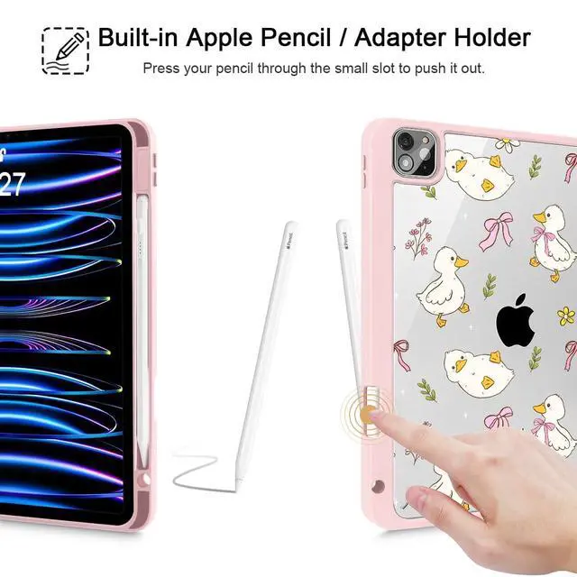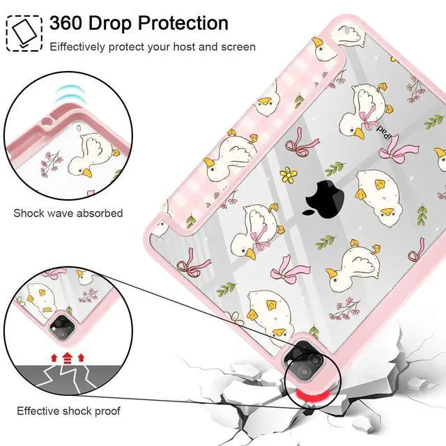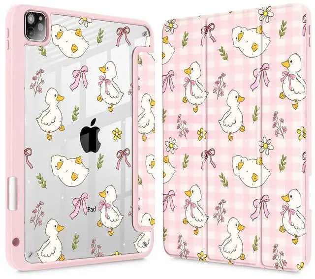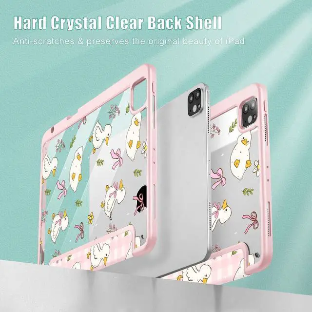 Lepeoac Case for iPad 12.9 Inch (6th/5th/4th/3rd Generation, 2022/2021/2020/2018), Pencel Holder + Trifold Support Auto Sleep/Wake, Transparent Shockproof Back Cover, Duck & Bow