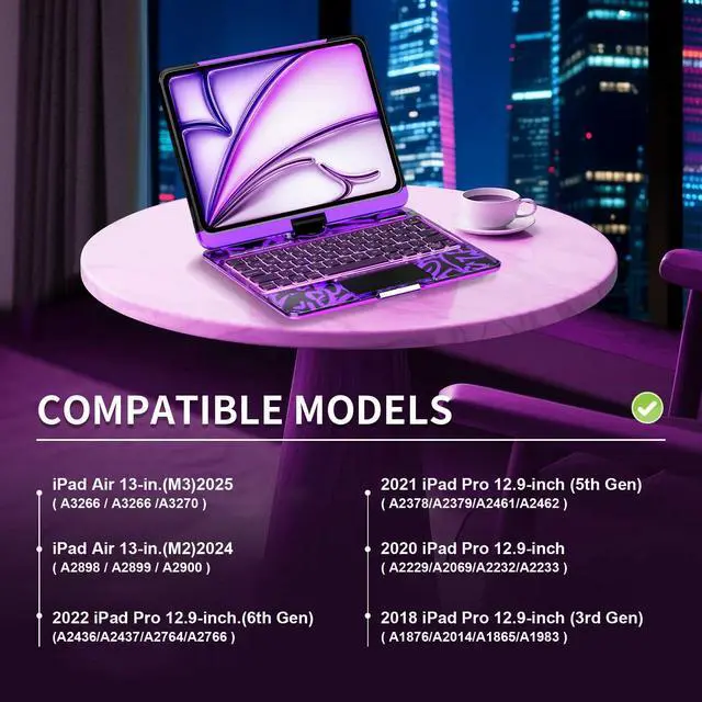 Precision Fit+Model CoverageThis keyboard case is specifically designed for the iPad Air 13-inch (M3/M2, 2025/2024 models) and iPad Pro 12.9 -inch (6th to 3rd generation, 2018-2022 models), fully compatible with the following models: A2764, A2437, A2436, A2378, A2379, A2461, A2462, A2229, A2069, A2232, A2233, A1876, A2014, A1895, A1983. Before purchasing, please verify the model number starting with A on the back of your device to confirm compatibility. ^^ High-Precision TouchpadEquipped with a multi-touch touchpad that responds instantly, it supports precise cursor control and a variety of gesture operations. It delivers a smooth notebook-level experience for text editing, web browsing, or media playback, significantly boosting productivity and creative expression. ^^ Multi-Angle Adjustable StandFeaturing a 360 rotating pivot and 199 hinge design, it supports suspension at any angle for quick switching between landscape and portrait modes across various scenarios. Whether typing, watching movies, reading, or gaming, it delivers a comfortable viewing experience. ^^ Seven-Color Backlight + Smart Shortcut KeysThe keyboard features seven backlight colors and multiple brightness levels, ideal for low-light or nighttime use. Integrated multimedia shortcut keys allow quick adjustments to volume, playback controls, and screen brightness, enhancing operational convenience. ^^ Transparent Shock-Resistant Structure + Pen Slot DesignFeatures a high-transparency hard shell that showcases the device's true colors, combined with reinforced impact-resistant edges and shock-absorbing construction to effectively withstand everyday drops and scratches.