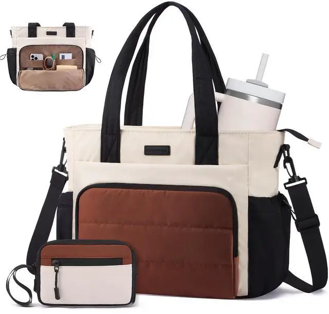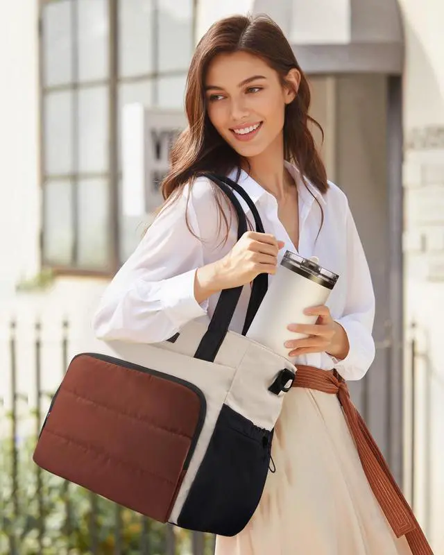 Spacious & Super OrganizedWith around 10 interior and exterior pockets plus a padded laptop sleeve, this tote keeps everything in placefrom your tech to daily essentials. No more digging around! ^^ Never Spill, Always SecureKeep drinks upright in the internal cup pocket or the adjustable external bungee holderperfect for 40oz tumblers with handles. No more leaks, no more mess! ^^ Carry Your Way, Every