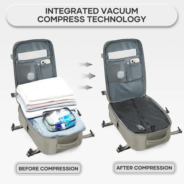 ^^ Durable Design: This travel backpack with vacuum system is made of thickened polyester fiber that can be reused for many years and can withstand rainwater. The sturdy metal double zipper and upgraded reinforced stitching extend its lifespan. Adjustable padded shoulder straps and shock absorbing foam ensure all day comfort even on long trips.