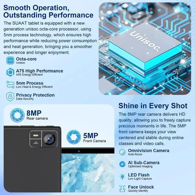 OCTA-CORE: The S10 tablet runs on Android 15 and is powered by a 2.0 GHz octa-core processor, boosted by integrated Gemini AI for personalized support with complex tasks. SUAAT tablet offers performance and privacy for faster launches and seamless operation across all apps ^^ 30GB + 128GB +