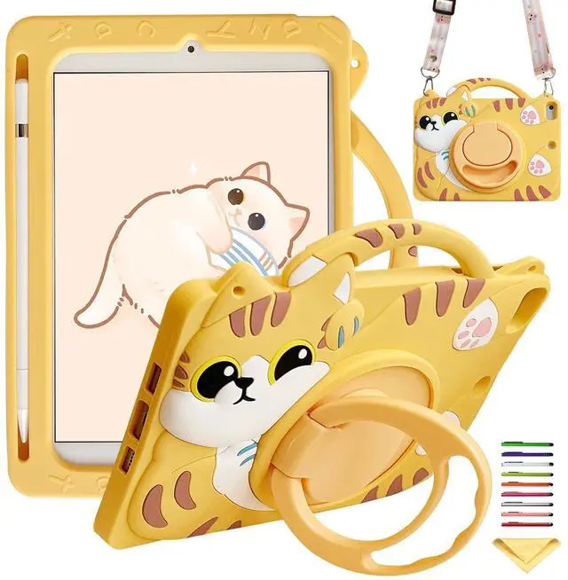 Kids Case for iPad (A16) 11th Gen 11" 2025/ iPad 10th Generation 10.9 inch 2022, UUcovers 360 Rotating Ring Handle/Stand Case with Pencil Holder/Shoulder Strap Girl Boy Cute Soft Cover, Yellow Cat