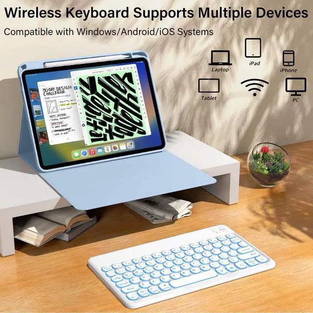kenke for iPad 11/10th Gen Case with Keyboard 11/10.9 inch 2025 A16/2022, Detachable Wireless Bluetooth Keyboard Case with Right Side Pencil Holder, Backlit White Round Keycaps (Blue