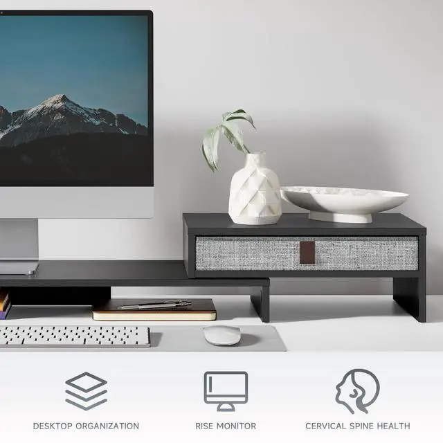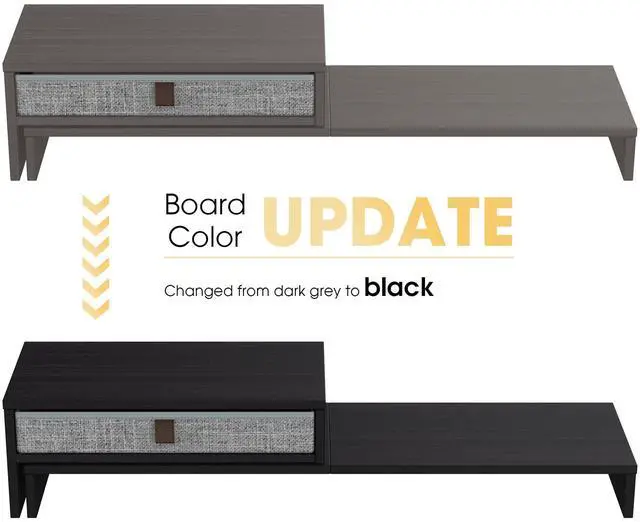 Length Range: 30.8 ''- 44.5 '', Angle: -90 to +90, two heights are available and swap left and right, if you need, you can let two screens are almost at the same level ^^ Perfect Desktop OrganizerOur computer monitor riser includes 9.25 inches practicality slide-out drawers for storing items like post-it notes, writing utensils and mobile devices. The keyboard can be placed under the bracket, save more space on your desk. ^^ Sturdy Computer Stand Extremely sturdy and stable, monitor stand is made of high-quality thickened MDF panel( 0.47 inch thickness). Maximum weight of 30kg/66lbs, you don't have to worry about collapsing or shaking during use. ^^ Computer Monitor Riser Easy Installation, In just a few minutes, you can get a multi-functional desktop stand, making you more comfortable and efficient at work. ^^ The wood used for the cabinet is FSC-certified.