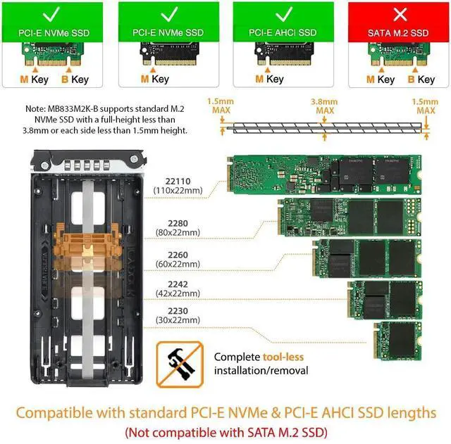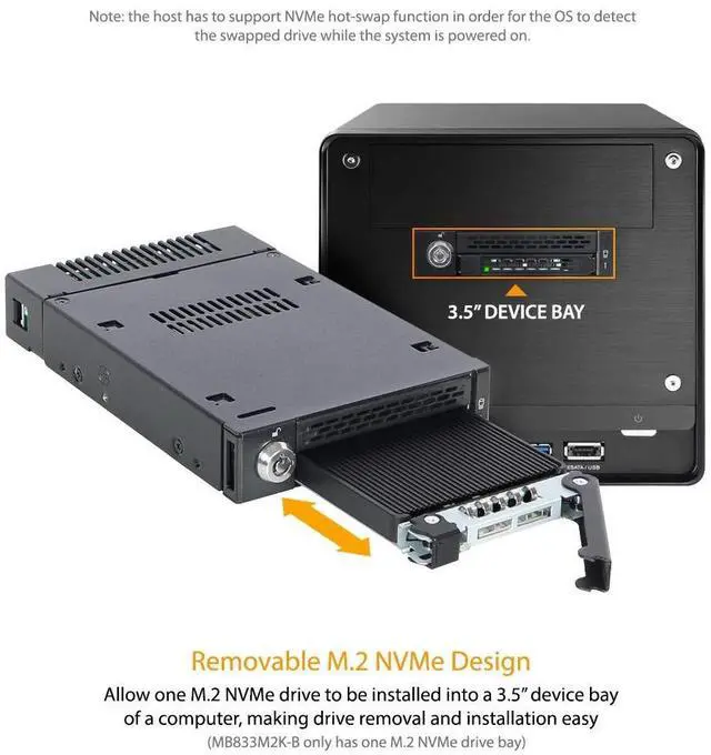 Introducing ToughArmor MB833M2K-B, the worlds first ruggedized M. 2 PCIe NVMe SSD tool-less removable rack. Your M. 2 NVMe SSD no longer requires to be installed on a motherboard or a riser card with a tiny screw, but it can now be installed and accessed from the front of your computer without any tools! The ToughArmor MB833M2K-B comes with a patent-pending tool-less M. 2 drive installation design which will alleviate the pain that many users experience when installing M. 2 drives and offer easy drive maintenance and system upgrading. The ToughArmor MB833M2K-B supports blazing-fast PCIe x4 transfer speed up to 32Gb/s via MiniSAS HD (SFF-8643) and accepts all standard M.