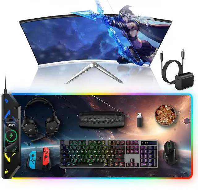 Please Note that both ports are input ports and cannot be used as output ports for power supply ^^ Max 15W Fast Qi Wireless Charging The round raised magnetic charging area has built-in powerful magnets that makes it easy to align the wireless charging position to charge your device, designed for iPhone 17/16/15/14/13/12, AirPods Pro 2nd/Pro/4rd/3rd/2rd (magnetic wireless charging case version only). It also provides up to 15W fast charging for Samsung Galaxy S23/S22/S21/S20/S10/S9/S8/Note 9/8 and other Qi wireless charging-enabled devices. Not compatible with any Apple Watch model ^^ One-Touch Control for 4 Light Modes & 11 RGB Colors This RGB gaming mouse pad has 11 lighting colors and 4 cool lighting modes: Single Color Static, Single Color Breathing, Rainbow, and Faster Rainbow Mode. Long press the RGB light mode option key to control the light on/off (one click also turns on the RGB light); click the option button to toggle between the 11 light colors; and a quick double-click on the option button to toggle between the 4 light modes ^^ Ultra-Smooth Surface This gaming mouse pad is designed with a smooth textile weave to ensure that you have precise control of your mouse with a smooth glide; the comfortable and smooth surface also can also be used as a mouse pad, desk mat, desk blotters and writing pad ^^ Non-Slip Rubber Base The soft and dense non-slip rubber base can keep this desk mat provides excellent grip and keeps the mousepad firmly in place on your desktop, so you can simply immerse yourself in your work or game without worrying about the annoying mouse pad moving around ^^ Durable & Easy to Clean Protects your desktop from scratches, stains, spills, heat and scuffs. The waterproof surface is easy to clean, just wipe with a wet cloth or paper; stitching around the edges of the table pad ensures a more durable and long-lasting pad that won't fray or peel ^^ What You Get Wireless Charging Mouse Pad x 1, 20W USB-C Fast Charger Block x 1, 6.56 ft USB-C to USB-C Woven Cable x 1, User Manual x 1, 24 hour friendly customer service and 12 months of full technical support