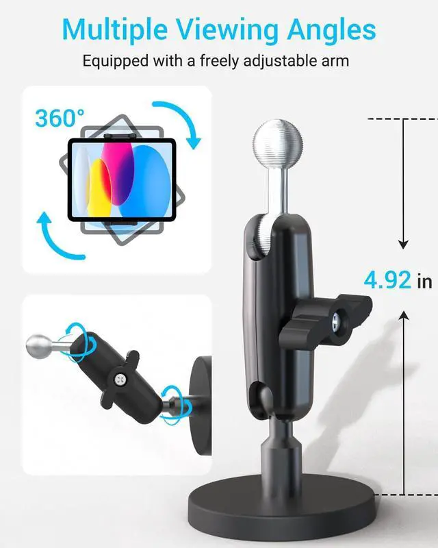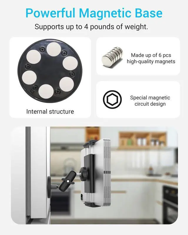 Upgraded Magnetic Base The iPad magnetic mount uses six premium magnets and an ABS shell with a unique magnetic circuit design, delivering stronger and more stable magnetic attraction. It can be easily fixed to a refrigerator surface, allowing you to read recipes while cooking and completely free your hands. ^^ Sturdy Metal Arm Compared with ordinary plastic mounts, the metal Arm arm is sturdy and durable, supports 360 rotation and flexible adjustment, and resists damage for long-term use. ^^ Multi-Surface Mounting Comes with a metal mounting plate, enabling secure installation even on non-metal surfaces such as tiles or wallsexpanding its range of applications.