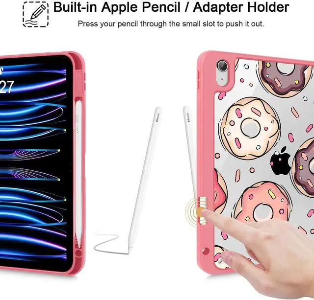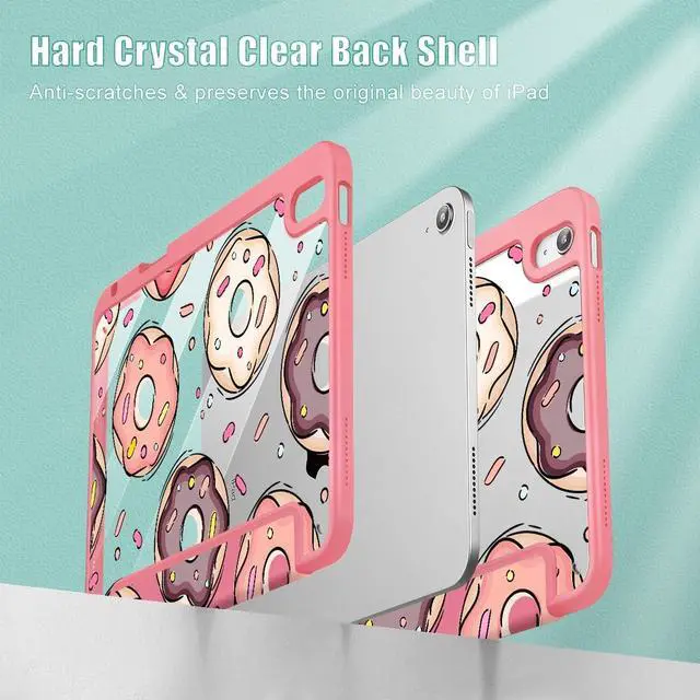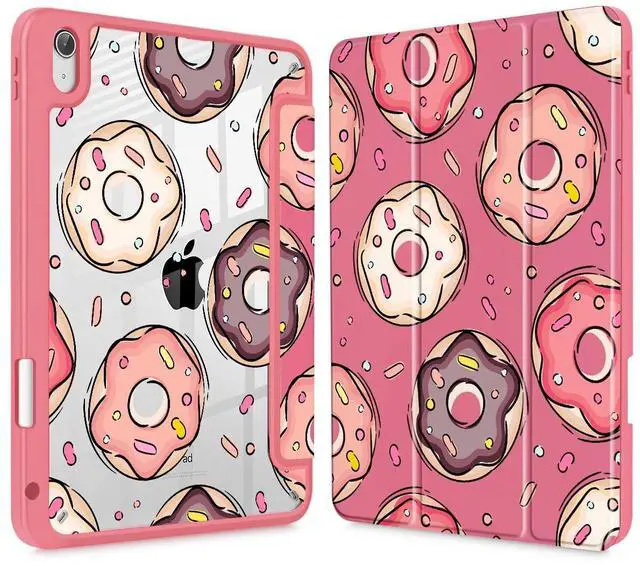 ICEKEE Case for iPad (A16) 11th Gen 11 Inch 2025, iPad 10th Gen 10.9 inch 2022 with Pencil Holder, Slim Printed Stand Protective Cover with Hard PC Translucent Back Shell Cover, Donuts -Red