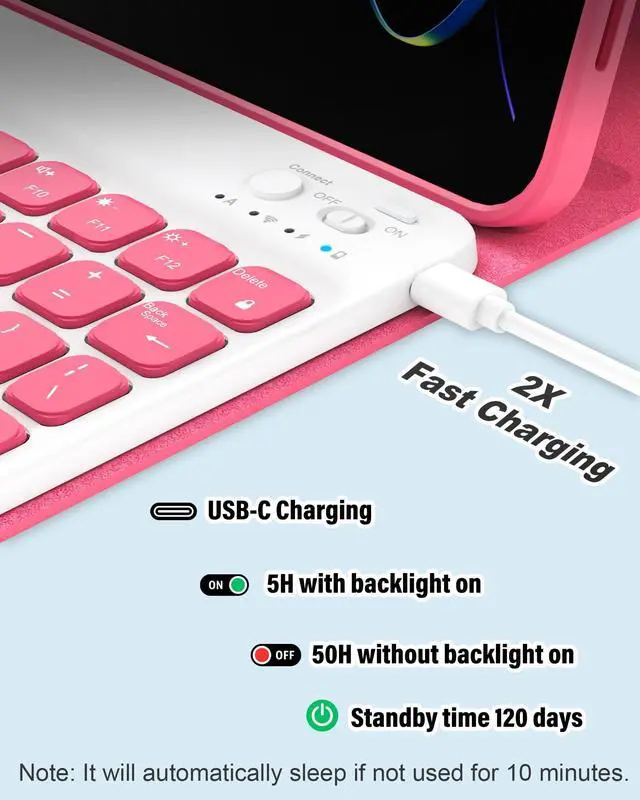 Battery Life: Equipped with a 420mAh high-capacity battery, our keyboard for ipad 10th generation supports USB-C fast charging. A full charge ensures extended usage, and the apple ipad keyboard automatically enters sleep mode after 10 minutes of inactivity to conserve battery life. ^^