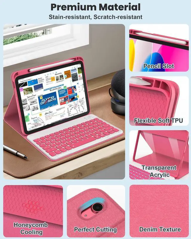 ^^ Premium Materials: Crafted with a denim-textured fabric, our ipad 9th generation case with keyboard is resistant to stains and wear, ensuring long-lasting durability. The back cover features a TPU + transparent acrylic design with four ventilation holes, ensuring better heat dissipation for prolonged use. This durable and protective case keeps your iPad safe from scratches, drops, and daily wear while maintaining a sleek and modern look.