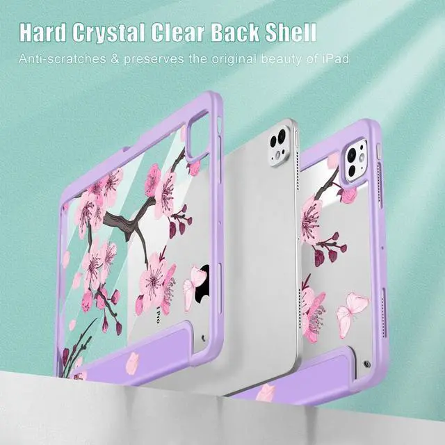 May Chen for iPad Pro 13 Inch Case M5 2025 / M4 2024, Built Pencil Holder & Clear Transparent Print Back Shell Slim Stand Shockproof Tablet Cover, Auto Wake/Sleep, Pink Cherry Blossom