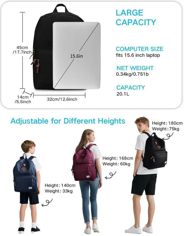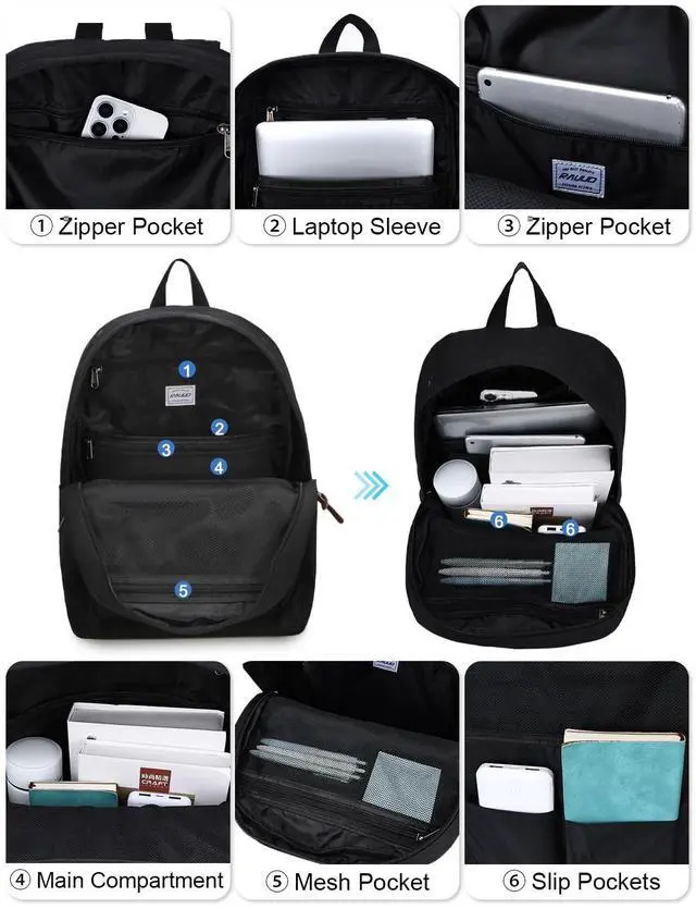 ^^ EASY TO ORGANIZE: Classic backpack features 10 pockets that fits all of the stuffs you need. External access to 2 front zipper pockets, 2 side pockets for water bottle, 1 anti theft back zipper pocket for wallet, Internal access to 1 main zipper compartment includes 1 padded laptop compartment fits 15.6 inch laptop, 2 slip pockets and 3 zipper pockets keep all your things organized and easy to access.