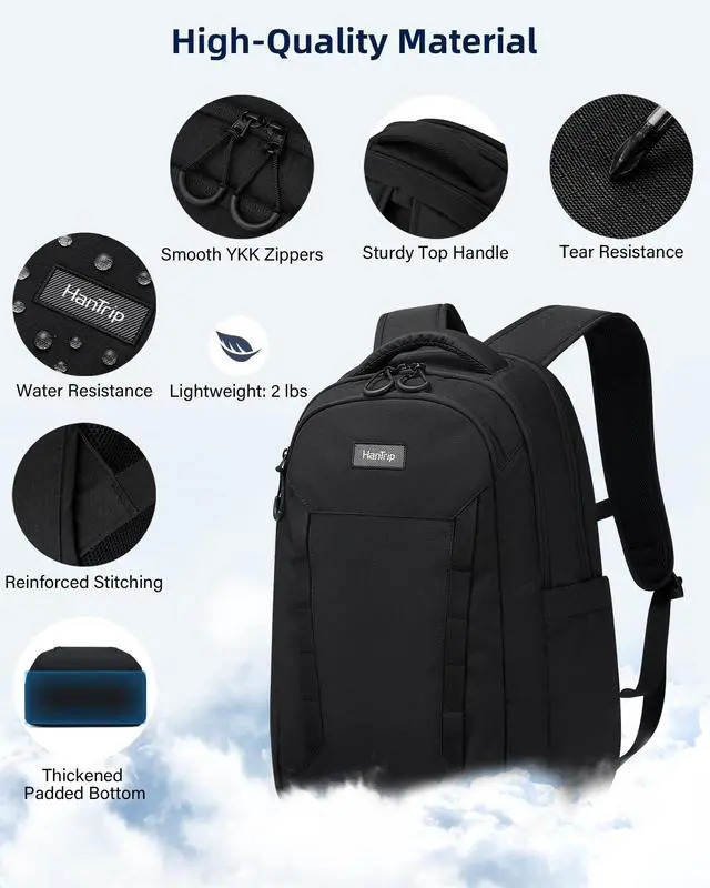 As large capacity backpack, its well-organized compartments keep travel essentials and daily items neatly stored and secured. ^^ Durable BackpackMade of high-quality polyester fabric, this computer backpack for men is lightweight but sturdy, scratch-resistant, wear-resistant and water-resistant. Features durable YKK zippers with pull tabs for smooth operation, reinforced triangle stitching at stress points, plus delicate embroidered logo detailing. The main compartment's thickened bottom padding keeping personal items safe and secure, making it a long-lasting choice among laptop backpacks. ^^ Comfortable Ergonomic DesignBackpack for travel features sturdy thickened top handle, as well as padded breathable back panel and shoulder straps for all-day comfort.