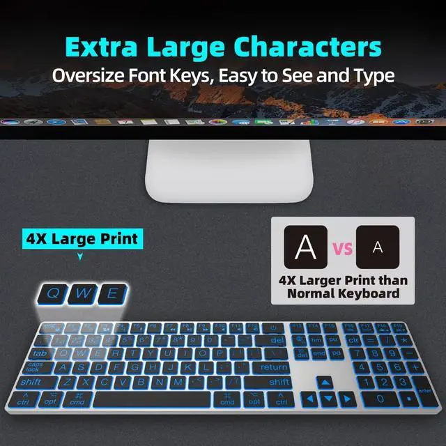 Large Print KeyboardDesigned with oversized key fonts that are four times larger than standard keyboards, this keyboard is perfect for seniors, students, and professionals who spend long hours typing. making typing more accessible and less straining ^^ Full Size Silent Flat Thin Bluetooth KeyboardB. Friend silent bluetooth keyboard is equipped with 110 upgraded scissor-switch keys, offering 90% noise reduction, durability up to 3 million keystrokes. The 2mm key travel and moderate rebound ensure comfortable typing. The high-end mela technology of matte UV-coated key caps makes the keyboard look more beautiful, easier to clean and have a better touch feel ^^ Quiet Typing Scissor Switch KeyboardB.