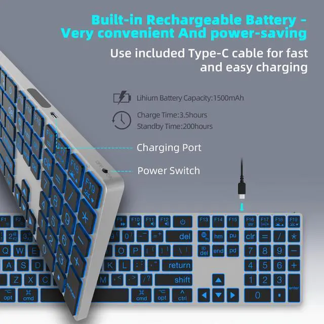 The 8 levels of brightness ensure optimal visibility in any lighting condition, while the ability to turn the backlight on or off adds flexibility based on your preferences ^^ Quick Charging and Long-Lasting Battery LifePowered by rechargeable battery, this keyboard offers an impressive 30 days of usage on a single 3.5 -hour charge (with backlight off). Its energy-saving mode automatically puts the keyboard to sleep after 10 minutes of inactivity, ensuring battery efficiency and extended life. Remember to fully charge before first use for optimal performance. You can also use the keyboard while charging