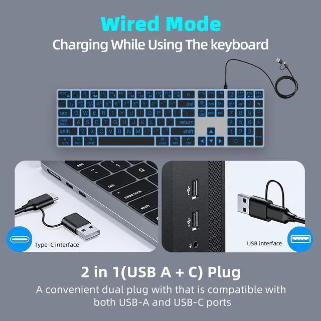 Each key of the Bluetooth keyboard is specially developed and designed for the Mac OS system (suitable for Macbook, Mac Mini, Mac Pro, iMac, iPad and iPhone). Not only is the layout consistent with the MAC keyboard, but also the typing feel is even better ^^ Smart Device SwitchingEquipped with Bluetooth 5.0 / Wired Dual Modes technology, this keyboard allows seamless switching among up to four devices, including MacBook, iMac, iPad, and iPhone. Intelligent OS recognition ensures that it automatically adapts to Mac layouts, providing a native typing experience across all Mac devices ^^ RGB 6 Backlight Modes - Rainbow & 7-Color Backlit With 7 vibrant backlight colors and 6 adjustable lighting modes, this keyboard allows you to personalize your typing ambiance.