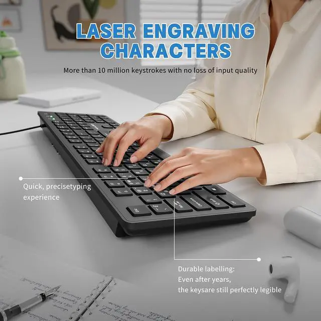 Letters: This USB wired keyboard adopts advanced laser engraving technology, which will not fade when typing for a long time, allowing you to clearly see letters and symbols, bidding farewell to the trouble of character wear and tear causing unclear reading