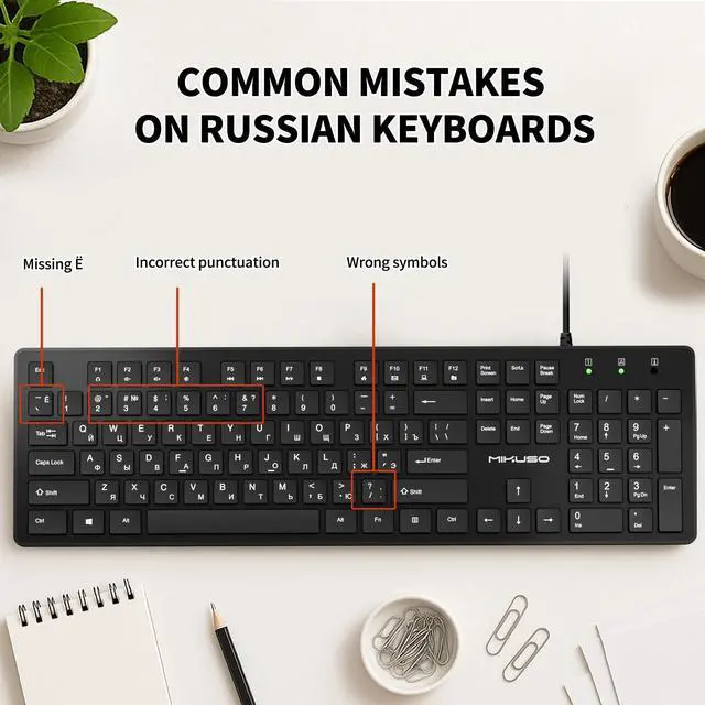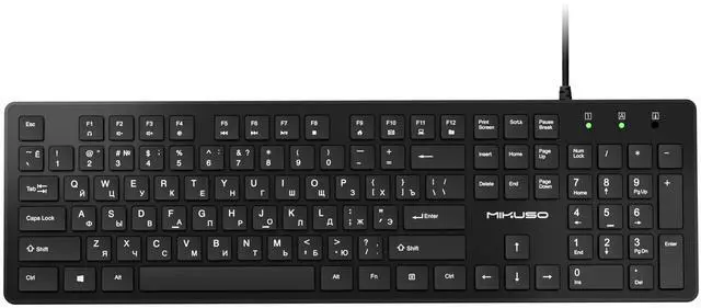 Waterproof and anti slip: The keyboard is waterproof, comfortable to the touch, Reduce finger pressure. with a wire length of 1.6 meters and anti slip stickers on the back, making the keyboard work efficiently,. The space bar has a crisp sound, not silent Russian QWERTY English 104 key keyboard layout with numeric keypad, Has all Russian letters including commonly missed ones (see pics) suitable for offices and work. There are uppercase lock indicator lights and numeric lock indicator lights in the upper right corner of the keyboard.