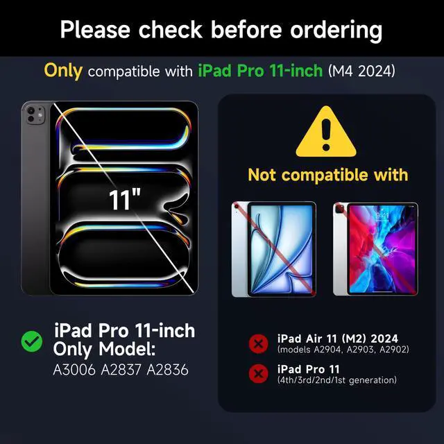 Perfect Compatibility: Exclusively for 11" iPad Pro M5 2025/M4 2024Verify model from iPad setting>General>About>Tap the model number once to reveal the actual model identifier(e. g., iPad Pro)before purchase!