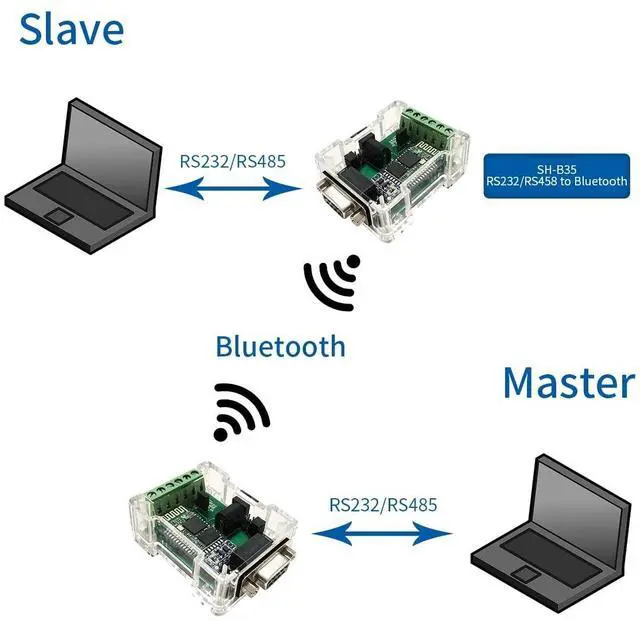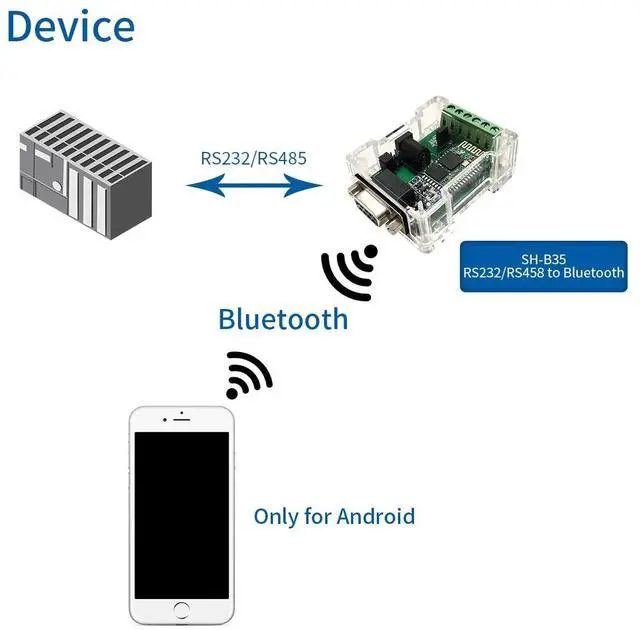 SH-B35 is an RS485/RS232 to Bluetooth converter. It is an upgraded version of SH-B23A (SH-B20) and SH-B30. With this converter, your computer or Android phone can connect to RS485/RS232 devices via