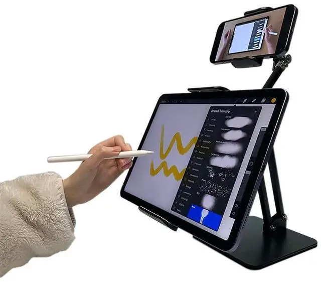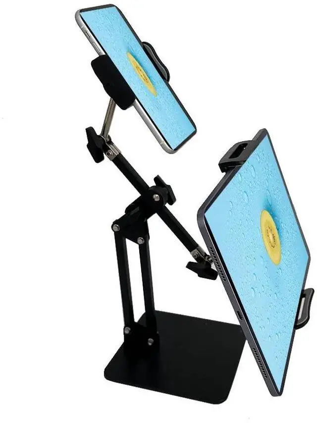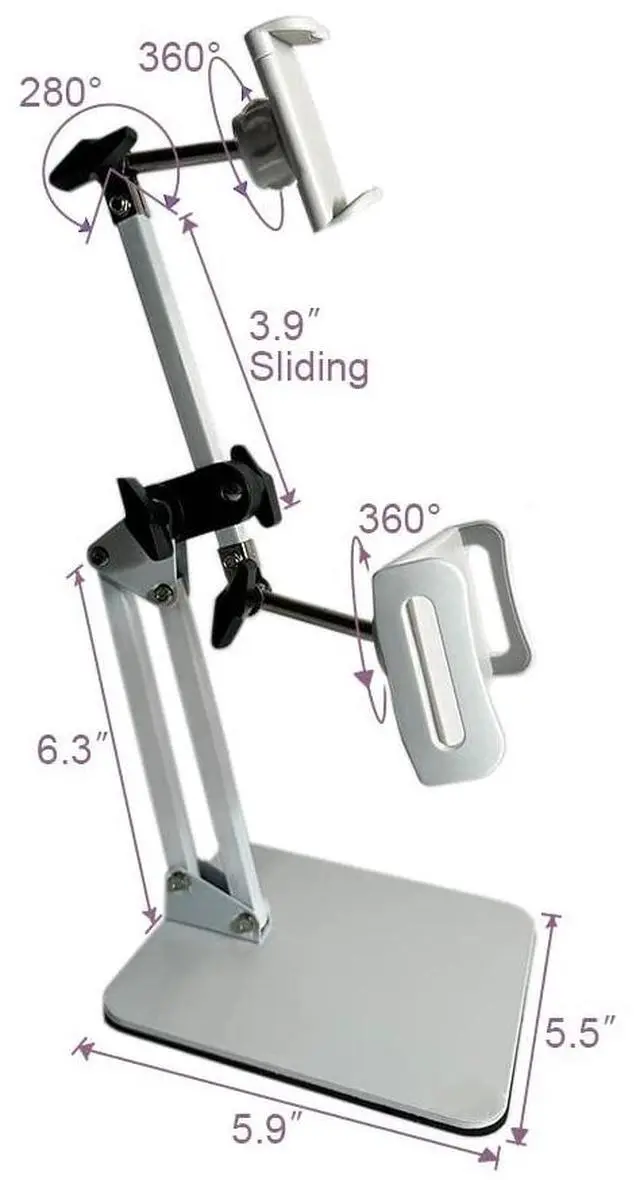 Adjustable & Versatile: This stand can hold two devices for viewing at the same time. It is useful for online classes, live streaming, online meeting, overhead shooting and more. With two metal arms and two 360-degree rotating Phone/Tablet holders, allowing you to adjust your devices to the most comfortable viewing position to relief your neck and shoulder pain.