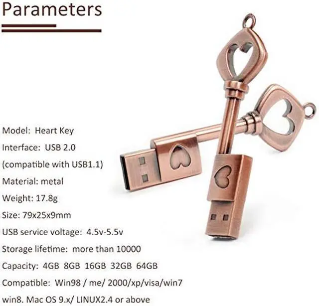 32GB Key Love Flash drive is a nice gift for your wife, husband, friend, wedding couple and family. Its beautiful, sturdy, and keeps all your memories safe with unique key-ring shape ^^ USB memory stick is suitable for digital data storing, transferring and sharing, Apply to data storage of music, photos, movies, designs, manuals, handouts, homework etc ^^ As a gift, you can storage some pictures, music, movies and good memory into computer u disk before you give this gift to them.