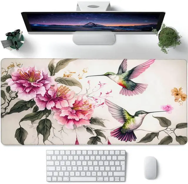 Desk Mat,Colibri and Pink Flowers Large Gaming Mouse Pad for Desk XXL,Birds and Floral Desk Pad,Extended Big Computer Keyboard Mouse Pad with Non-Slip Base and Stitched Edge 35.4"x15.7"